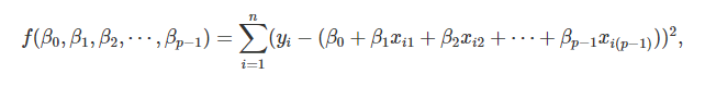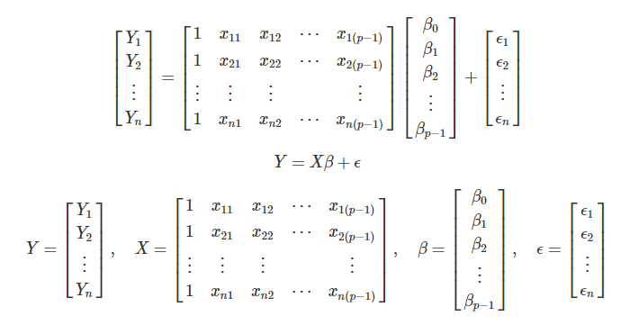 \[\hat{y} = \hat{\beta_0} + \hat{\beta_1}X_{i1} + \hat{\beta_2}X_{i2} + ... + \hat{\beta_{p-1}}X_{i_{(p-1)}} + \hat{\epsilon}\]