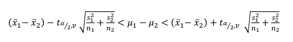 Si \(\bar{X_1}\) y \(\bar{X_2}\) son las medias muestrales de dos muestras aleatorias independientes de tamaño \(n_1\) y \(n_2\) de poblaciones normales con varianzas diferentes y desconocidas, un intervalo de confianza del \((1-\alpha)100\%\) para \(\mu_1-\mu_2\) está dado por la siguiente expresión: