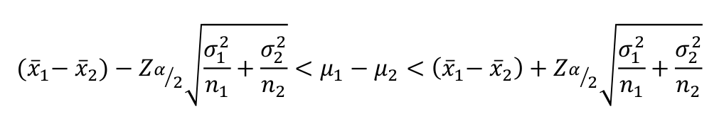 Si \(\bar{X_1}\) y \(\bar{X_2}\) son las medias muestrales de dos muestras aleatorias independientes de tamaño \(n_1\) y \(n_2\) de poblaciones normales con varianzas conocidas \(\sigma^2_1\) y \(\sigma^2_2\), respectivamente, un intervalo de confianza del \((1-\alpha)100\%\) para \(\mu_1-\mu_2\) está dado por la siguiente expresión: