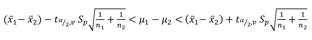 Si \(\bar{X_1}\) y \(\bar{X_2}\) son las medias muestrales de dos muestras aleatorias independientes de tamaño \(n_1\) y \(n_2\) de poblaciones normales con varianzas desconocidas e iguales, un intervalo de confianza del \((1-\alpha)100\%\) para \(\mu_1-\mu_2\) está dado por la siguiente expresión:
