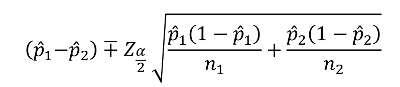 Si \(\hat{p_1}\) y \(\hat{p_2}\) son las proporciones de éxito de dos muestras aleatorias independientes de tamaño \(n_1\) y \(n_2\), entonces un intervalo del \((1-\alpha)100\%\) para \(\hat{p_1}-\hat{p_2}\) está dado por la siguiente expresión: