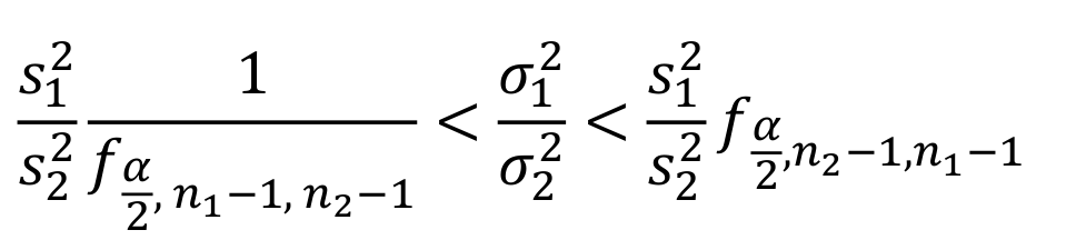 Si \(S^2_1\) y \(S^2_2\) son las varianzas muestrales de muestras aleatorias independientes de tamaño \(n_1\) y \(n_2\) de poblaciones normales, un intervalo de confianza del \((1-\alpha)100\%\) para \(\sigma^2_1/\sigma^2_2\) está dado por la siguiente expresión:
