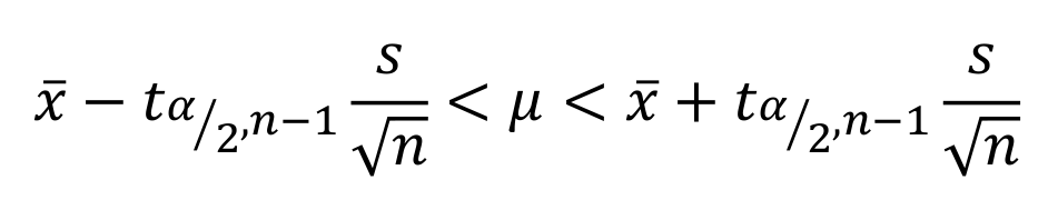 Si \(\bar{x}\) es la media de una muestra aleatoria de tamaño \(n\) de una población normal con varianza \(\sigma^2\) desconocida, un intervalo de confianza del \((1-\alpha)100\%\) para \(\mu\) está dado por la siguiente expresión: